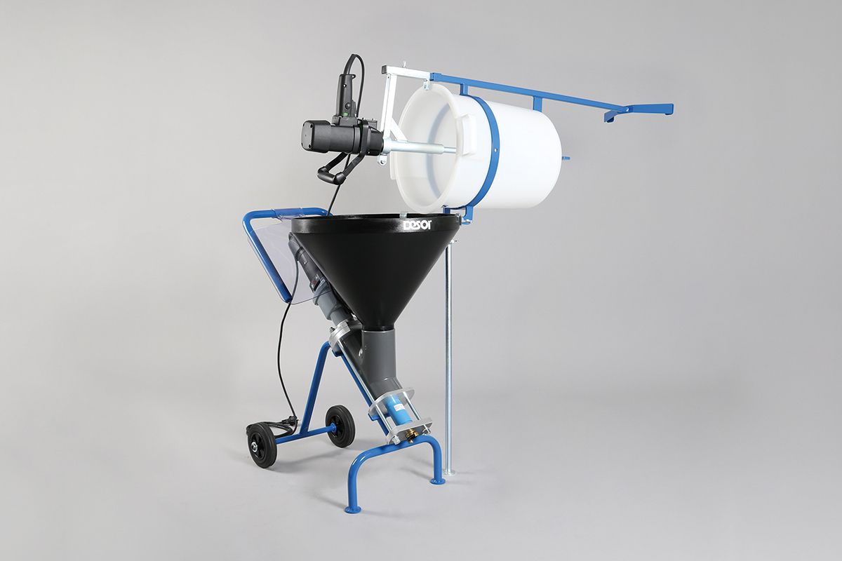 The add-on mixer with tilt mechanism DESOI Power-Mix-ABR 180 has been optimised for the perfect mixing of mineral materials with grain sizes 0 - 4 mm. The special design of each single cup ensures a gentle and homogeneous mixing of the material without air intake all over the mixing container. Using the mixer holder, the mixing device works automatically while the injection work is carried out (1-person-operation). The tilt mechanism allows an ergonomic decanting of the fresh material from the mixing container into the material container of the screw pump SP20.
